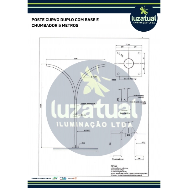 Informações do produto: POSTE CURVO DUPLO BASE E CHUMBADOR 5 METROS