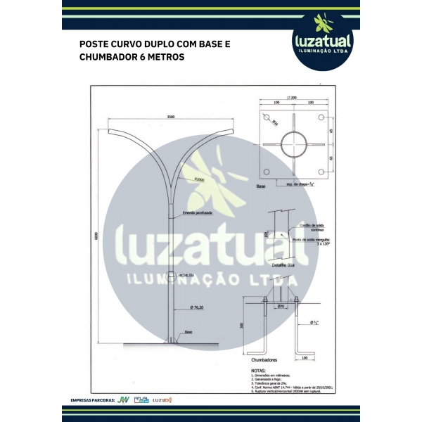 Informações do produto: POSTE CURVO DUPLO BASE E CHUMBADOR 6 METROS