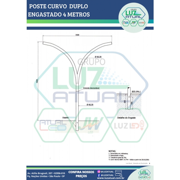 Informações do produto: POSTE CURVO DUPLO ENGASTADO 4 METROS