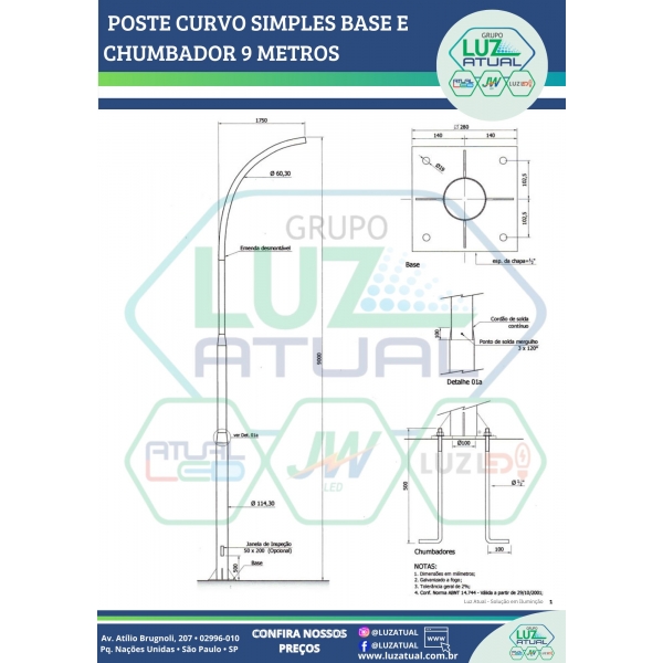 Informações do produto: POSTE CURVO SIMPLES BASE E CHUMBADOR 9 METROS