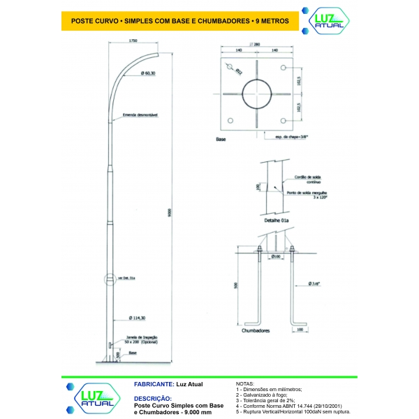 Informações do produto: Poste Curvo Simples com Base e Chumbadores - 9 Metros