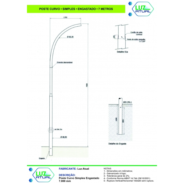 Informações do produto: Poste Curvo Simples Engastado - 7 Metros