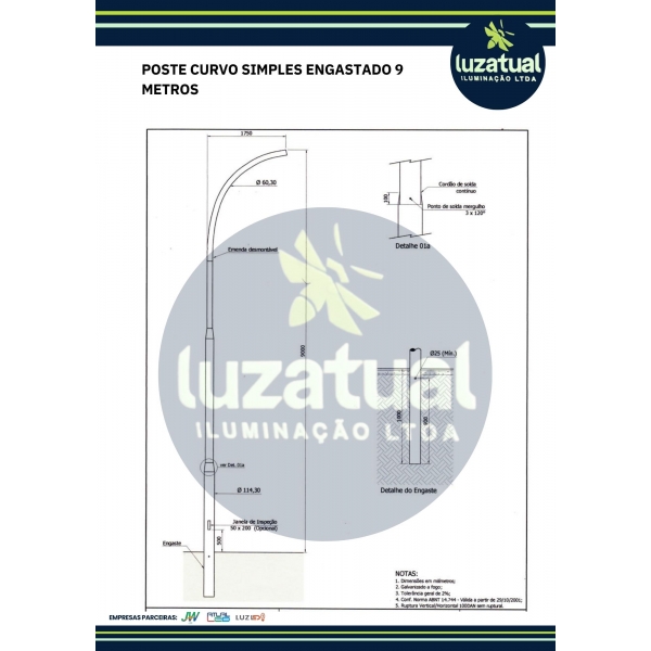 Informações do produto: POSTE CURVO SIMPLES ENGASTADO 9 METROS