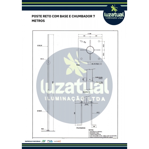 Informações do produto: POSTE RETO BASE E CHUMBADOR 7 METROS